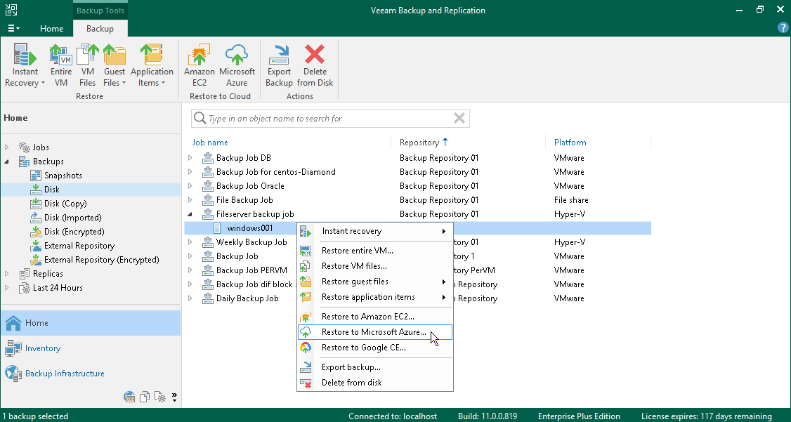 - Open the Home view. In the inventory pane, click Backups. In the working area, expand the necessary backup, select workloads that you want to restore and click Restore to Microsoft Azure on the ribbon. Alternatively, you can right-click one of the workloads that you want to restore and select Restore to Microsoft Azure.