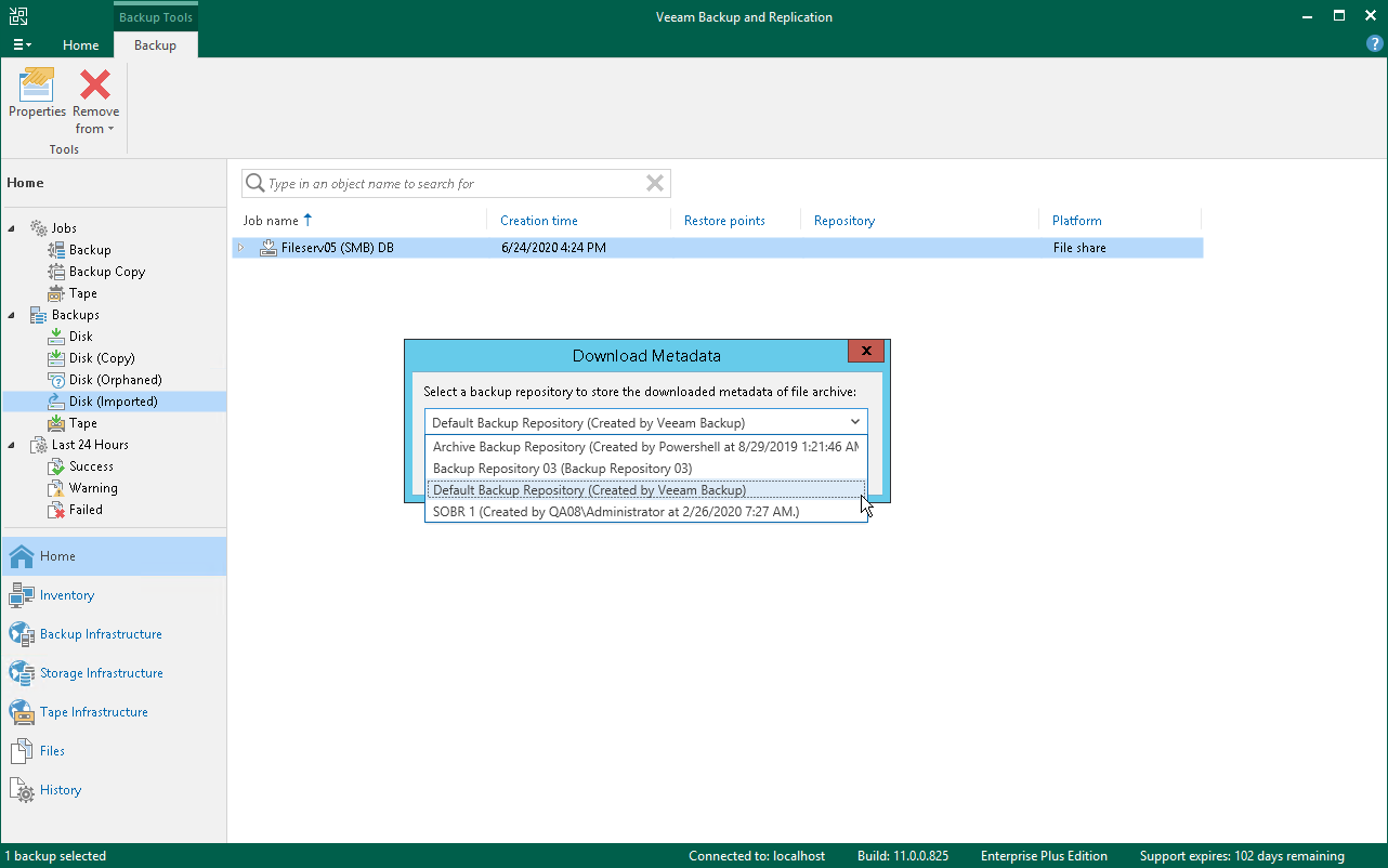- From the drop-down list, select a backup repository to store the downloaded metadata of files archive and click OK.