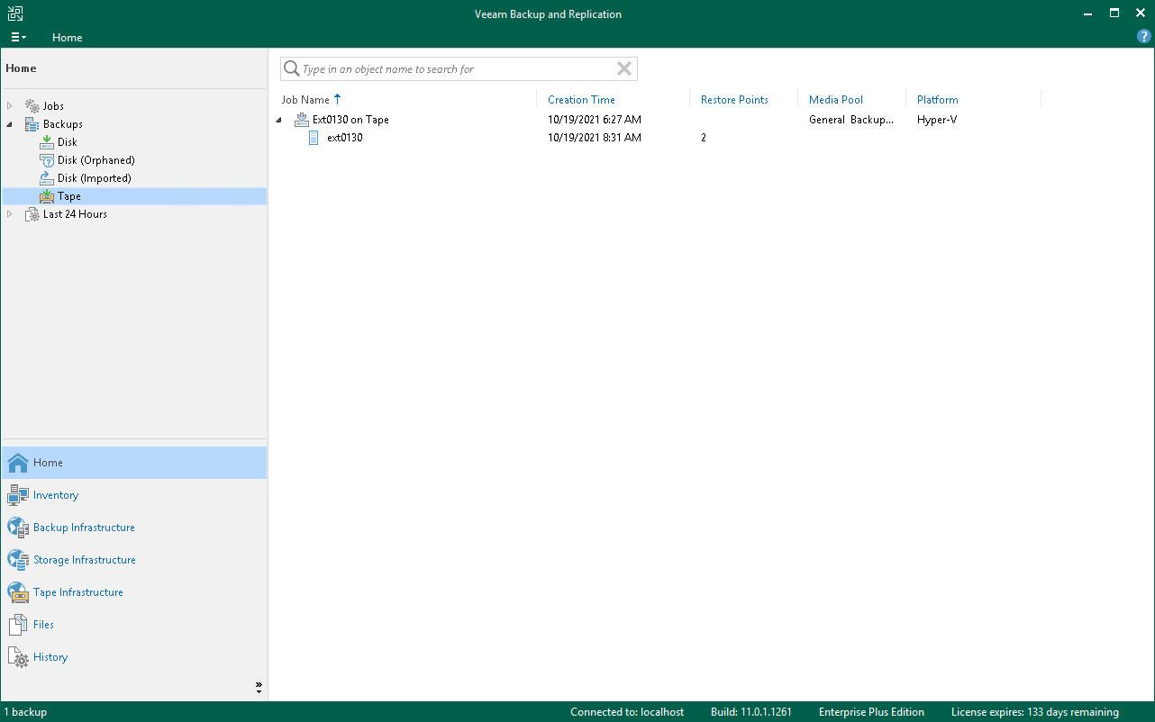 Viewing Backups on Tape After the backup to tape job completes, you can view the created archive on tape:Open the Home view.Expand the Backups > Tape node and locate the backup archive under the name of a corresponding job.