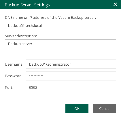 有关添加备份服务器的更多信息,请参见Enterprise Manager用户指南中的管理Veeam备份服务器