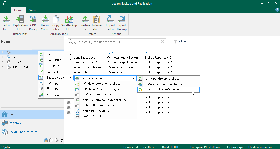 - 在目录窗格中,右键单击Jobs (作业) ,选择Backup Copy (备份拷贝) >Virtual machine (虚拟机) >Microsoft Hyper-V 备份以启动New Backup Copy Job (新建备份拷贝作业)向导
