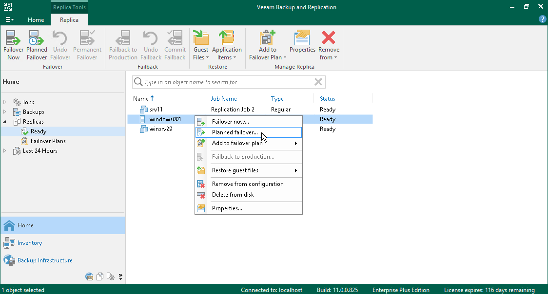 执行永久故障切换 如需执行永久故障切换,请执行以下操作:在Home(首页)视图的目录窗格中,单击Replicas (复制副本)节点。在工作区中,右键单击虚拟机复制副本,然后选择Permanent Failover (永久故障切换)。在打开的窗口,点击 Yes(是)以确认操作。参考有关永久故障切换的更多信息,请参见 永久故障切换在Veeam Backup & Replication用户指南的相关部分。