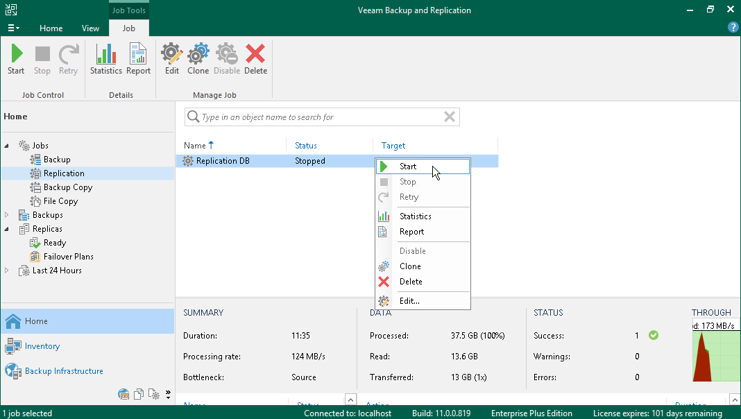 手动启动复制作业 如果未计划复制作业,则必须手动启动它。要启动作业,请执行以下操作:打开 Home(首页) 视图。在目录窗格中,选择Jobs (任务) >Replication(复制)。在工作区中,右键单击作业,然后选择 Start(启动)。等候作业完成。请注意,作业必须以成功或警告状态完成。打开 Hyper-V 管理器 并确保已创建虚拟机复制副本