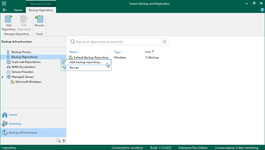 - 打开Backup Infrastructure (备份基础架构)视图,然后单击Backup Repositories (备份存储库)节点。添加的备份存储库必须在工作区中可用。