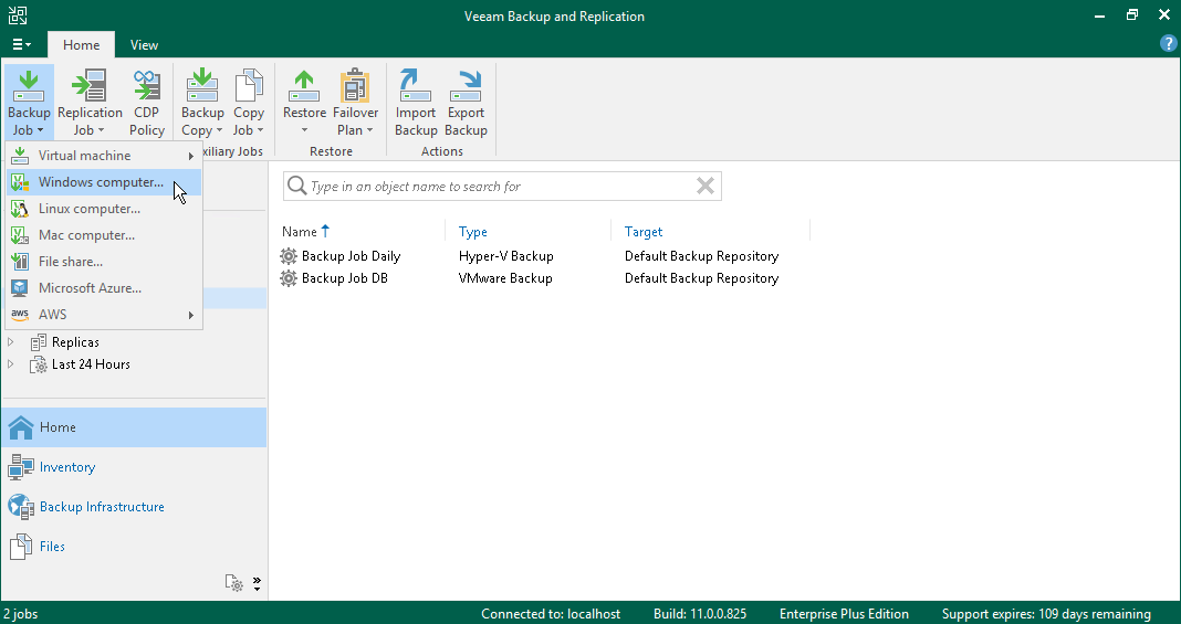 Veeam Backup & Replication支持您为Microsoft Windows和Linux计算机创建备份作业。在本节中,您将了解如何为Microsoft Windows计算机创建Veeam Agent备份作业。有关如何为Linux计算机创建备份作业的详细信息,请参见 Veeam Agent管理指南中的“为Linux计算机创建代理备份作业”。