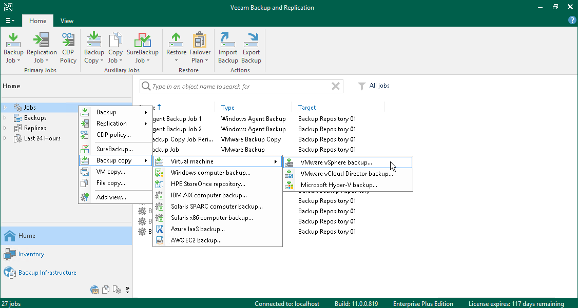 - 在目录窗格中,右键单击Jobs (作业) ,选择Backup Copy (备份拷贝) >Virtual machine (虚拟机) >VMware vSphere 备份以启动New Backup Copy Job (新建备份拷贝作业)向导