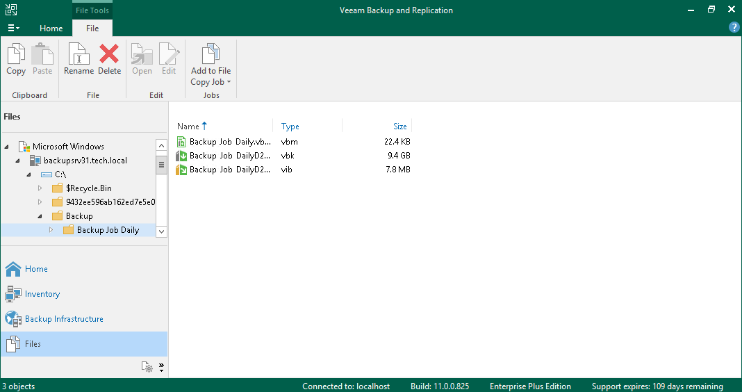 3. Backup (备份)文件夹中,找到带有备份作业名称的子文件夹,并将其打开。它必须包含。 VBK和.VBM文件。如果作业运行了多次,则子文件夹还包含.VIB或.VRB文件。