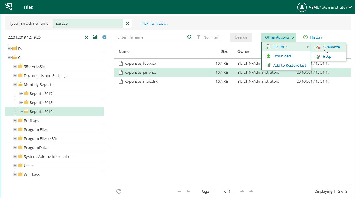 - 查找所需文件或文件夹,然后选择它。点击右上角的Other Actions (其他操作) >Restore (还原) >Overwrite (覆盖)。