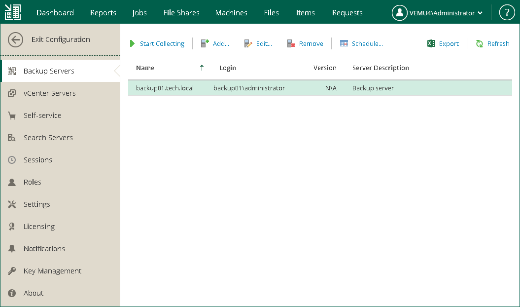 - 您已成功将备份服务器连接到Veeam Backup Enterprise Manager ,并从中收集了数据。有关详细信息,请参见添加Veeam备份服务器。