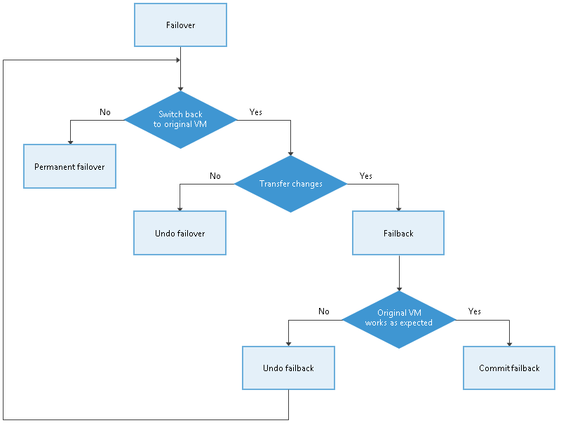 执行永久故障切换时,您将永久地从原始虚拟机切换到虚拟机副本并将此副本用作原始虚拟机。如果原始虚拟机和虚拟机复制副本位于同一站点,并且在资源方面几乎相等,则可以采用这种方案。