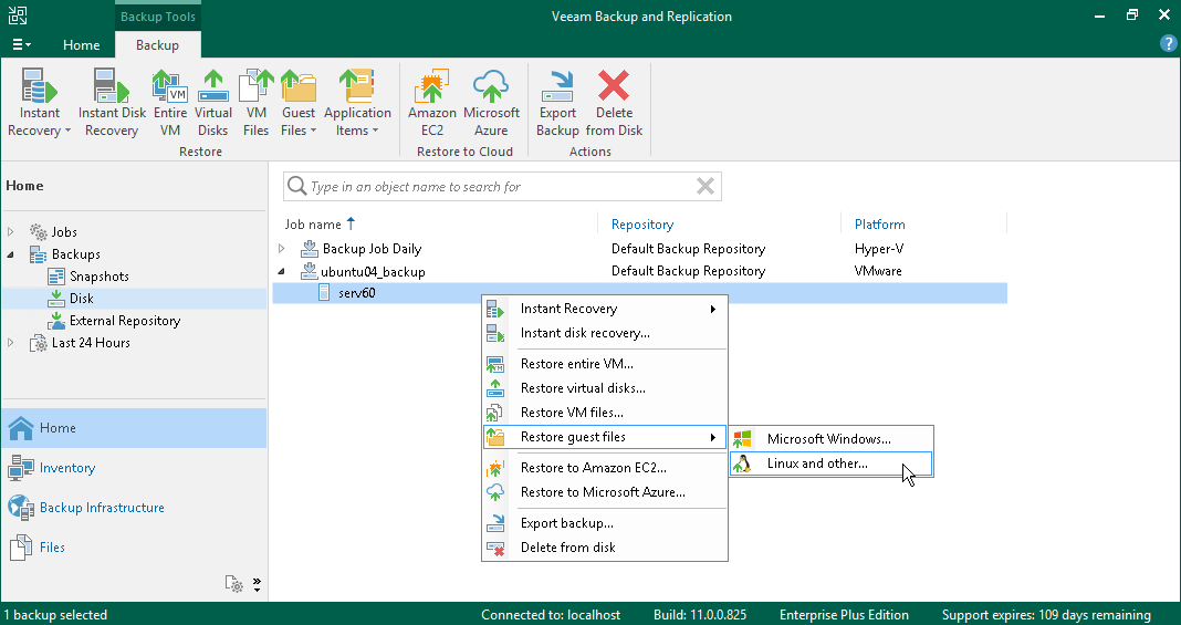 - 在目录窗格中,选择Backups (备份) >Disk (磁盘)节点。在工作区中展开一个备份作业,右键单击虚拟机,然后选择Restore guest files (还原客户机文件) >Linux and other (Linux和其他),以启动Guest File Restore (客户机文件还原)向导。