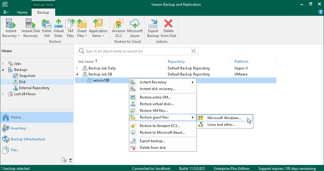 - 在目录窗格中,选择 Backup(备份) > Disk(磁盘)节 点。在工作区中展开一个备份作业,右键单击虚拟机,然后选择Restore guest files (还原客户机文件) >Microsoft Windows,来启动File Level Restore (文件级还原)向导。