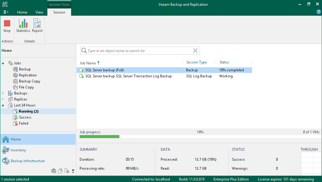 - 在Home(首页)视图的目录窗格中,展开Last 24 Hours (过去24小时)节点,查看创建的作业。您必须看到两个作业:一个作业处理Microsoft SQL Server ,另一个作业发送事务日志。