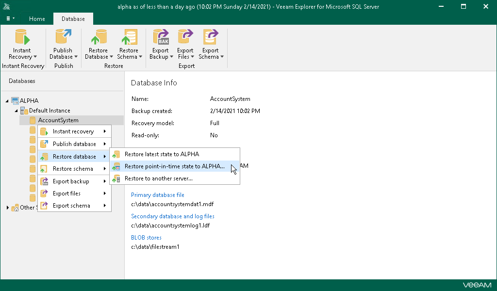 - 在窗口的Databases (数据库)窗格中,右键单击数据库,然后选择Restore point-in-time state to < Microsoft SQL Server\ Instance Name>。