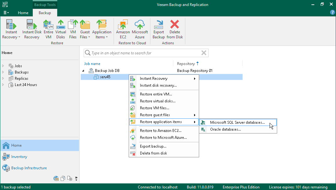 - 在工作区中,展开使用Microsoft SQL Server处理虚拟机的备份作业。右键单击虚拟机,选择Restore application items (还原应用程序项目) >Microsoft SQL Server数据库,以打开Microsoft SQL Server数据库还原向导。