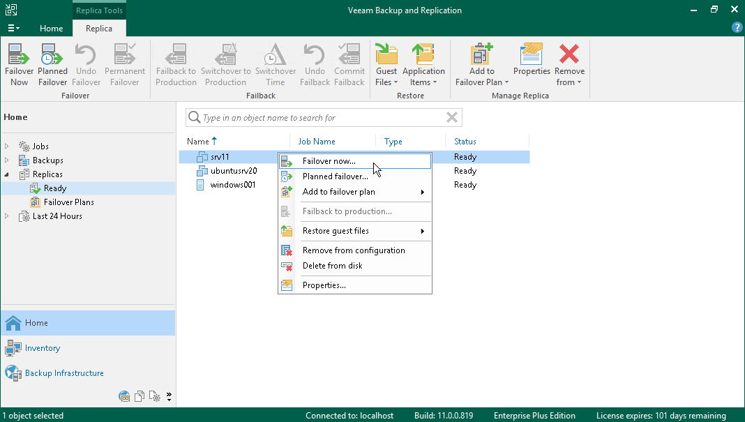 - 右键单击复制的虚拟机,然后选择Failover Now (立即故障切换),来启动VMware故障切换向导。