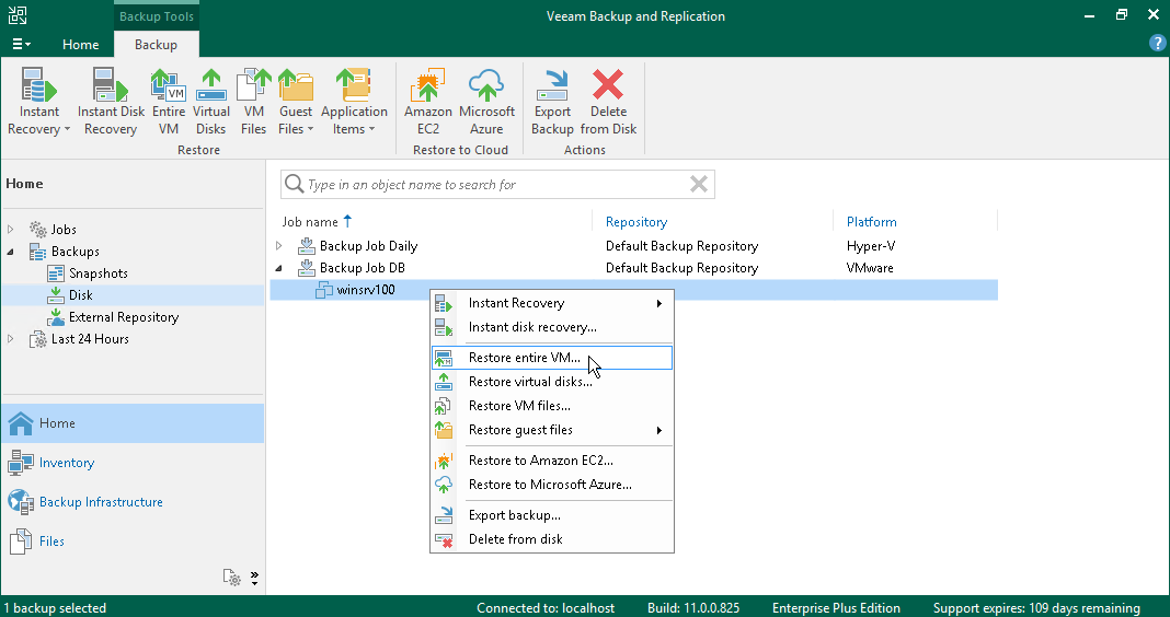 - 在目录窗格中,选择 Backup(备份) > Disk(磁盘)节 点。在工作区中展开备份作业,右键单击备份作业中的虚拟机,然后选择Restore entire VM (还原整个虚拟机),启动Full VM Restore (完整虚拟机还原)向导。