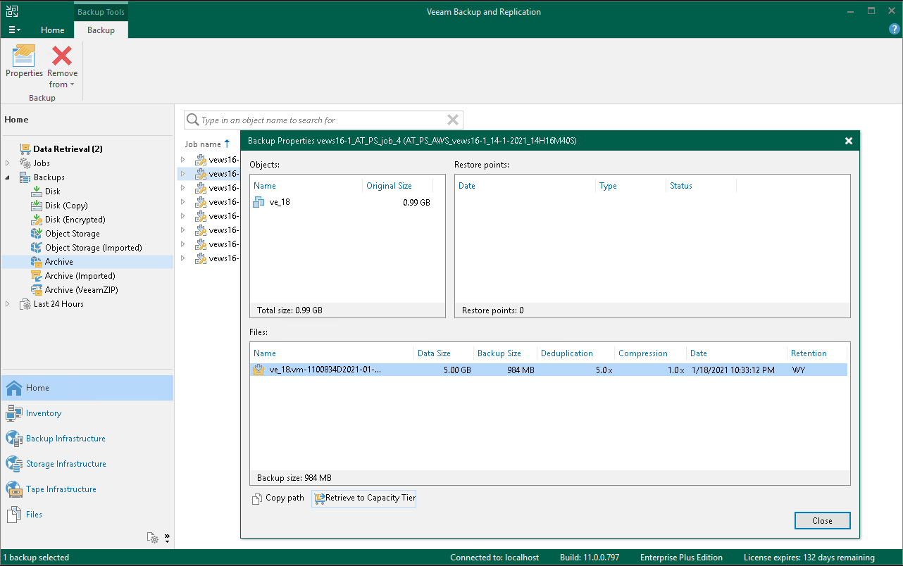 - Open the Home view. In the inventory pane select Archive. In the working area, select the backup job whose files you want to retrieve and click Properties on the ribbon. In the Backup Properties window, click on Retrieve to Capacity Tier.