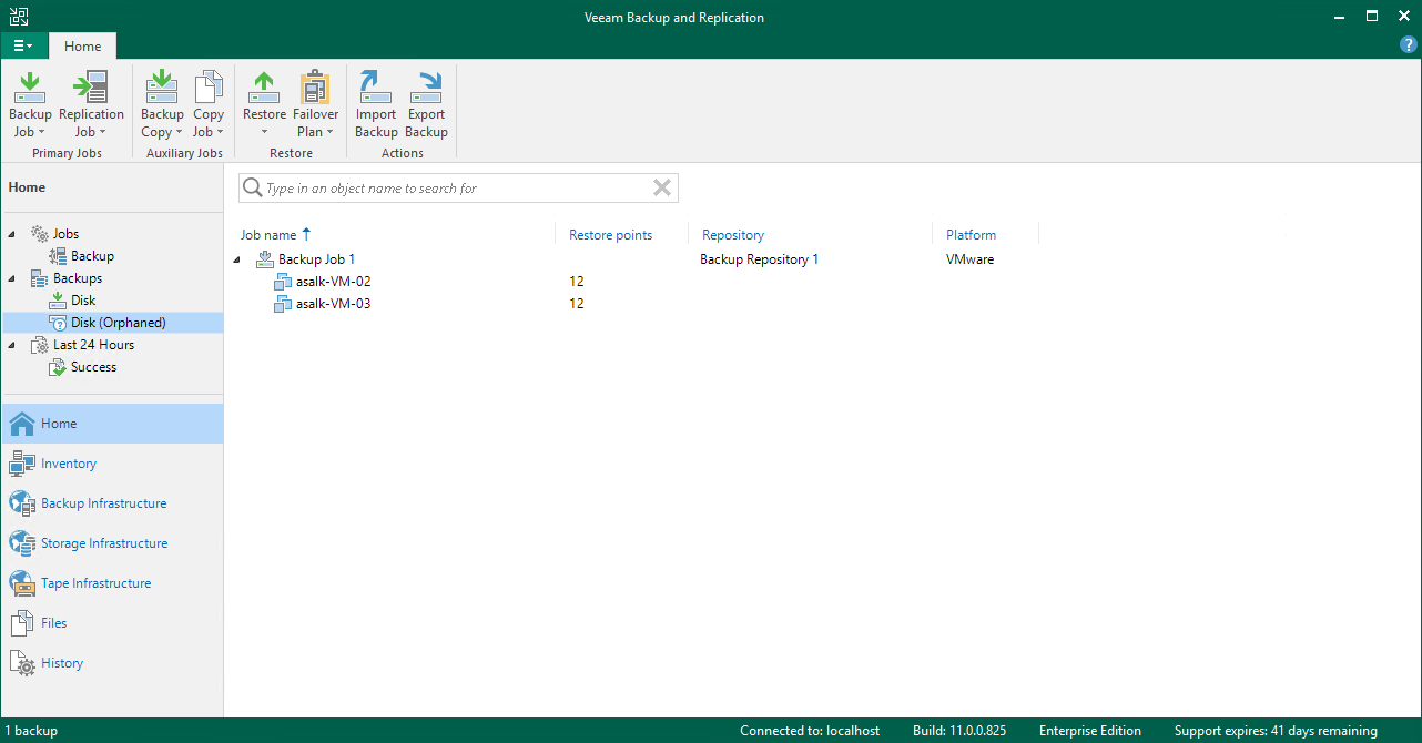 Background GFS retention applies to standard and orphaned backup files that are no longer processed by any jobs. The orphaned backup files are shown under the Home > Backups > Disk (Orphaned) node.