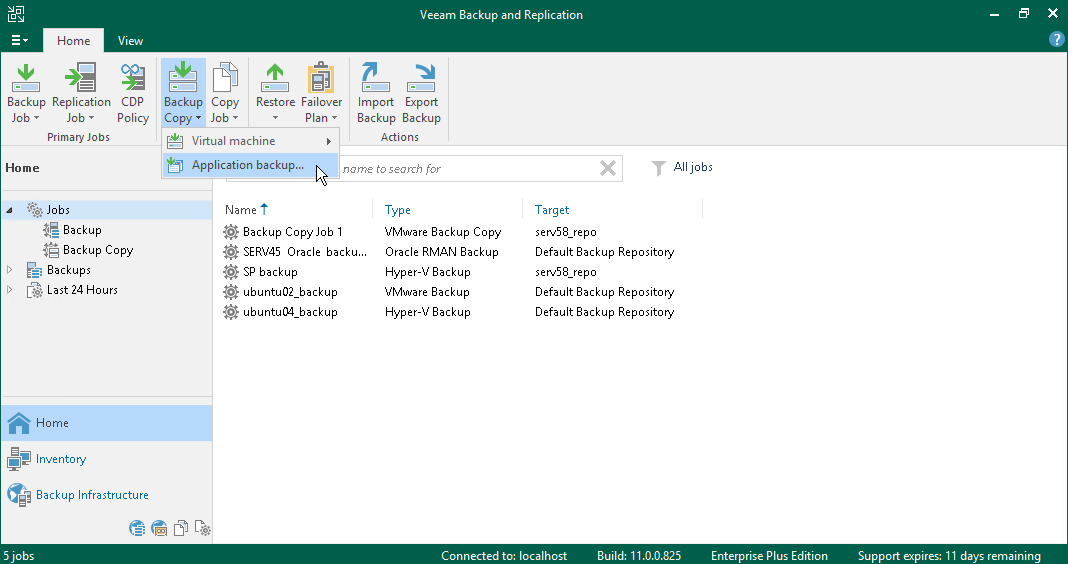 To create copies of Veeam Plug-in backups of Oracle and SAP HANA databases, you must configure a backup copy job. For more details, see the following sections of the Veeam Plug-ins for Enterprise Applications Guide: