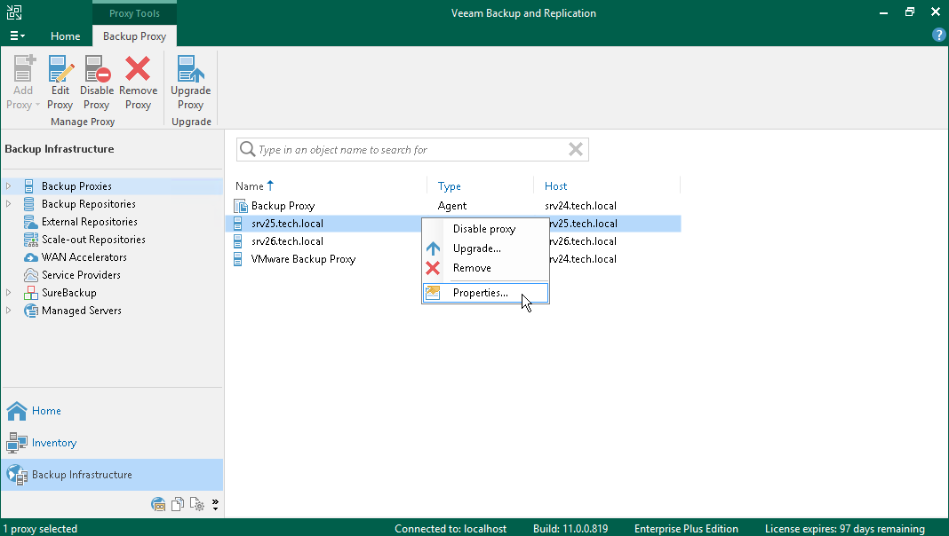 - In the working area, select the backup proxy and click Edit Proxy on the ribbon or right-click the backup proxy and select Properties.