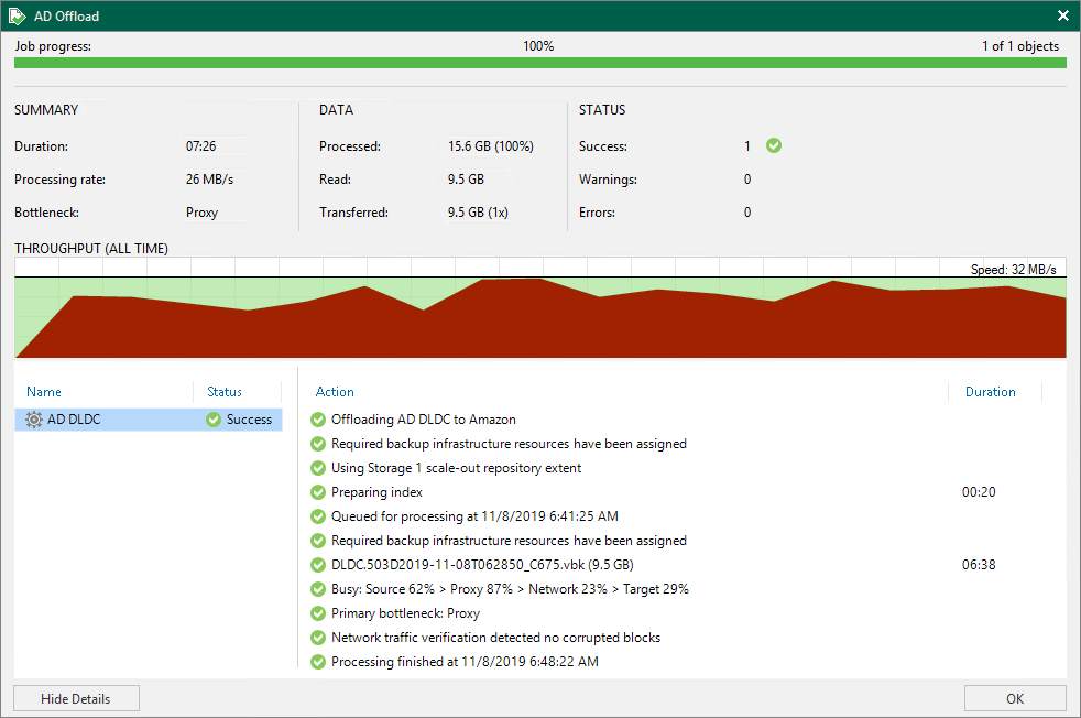 - Processing rate — average speed of VM data processing. This counter is a ratio between the amount of data that has actually been read and the offload session duration.