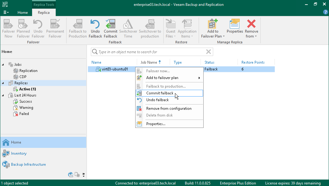 - In the working area, select the necessary replica and click Commit Failback on the ribbon. As an alternative, you can right-click the replica and select Commit failback.