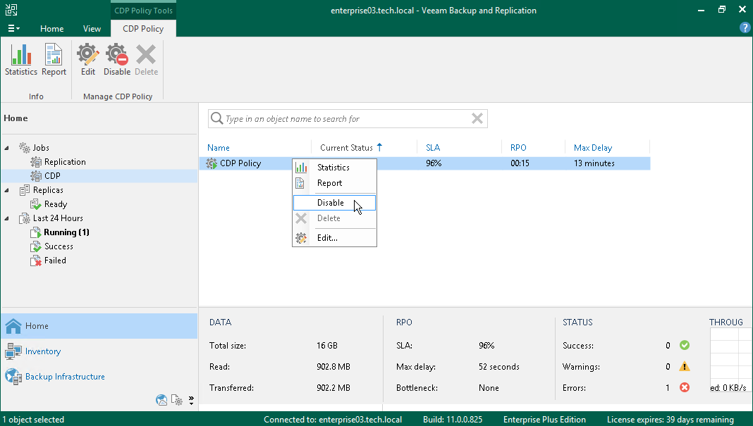 Veeam Backup & Replication allows you to temporarily disable or permanently delete created CDP policies.