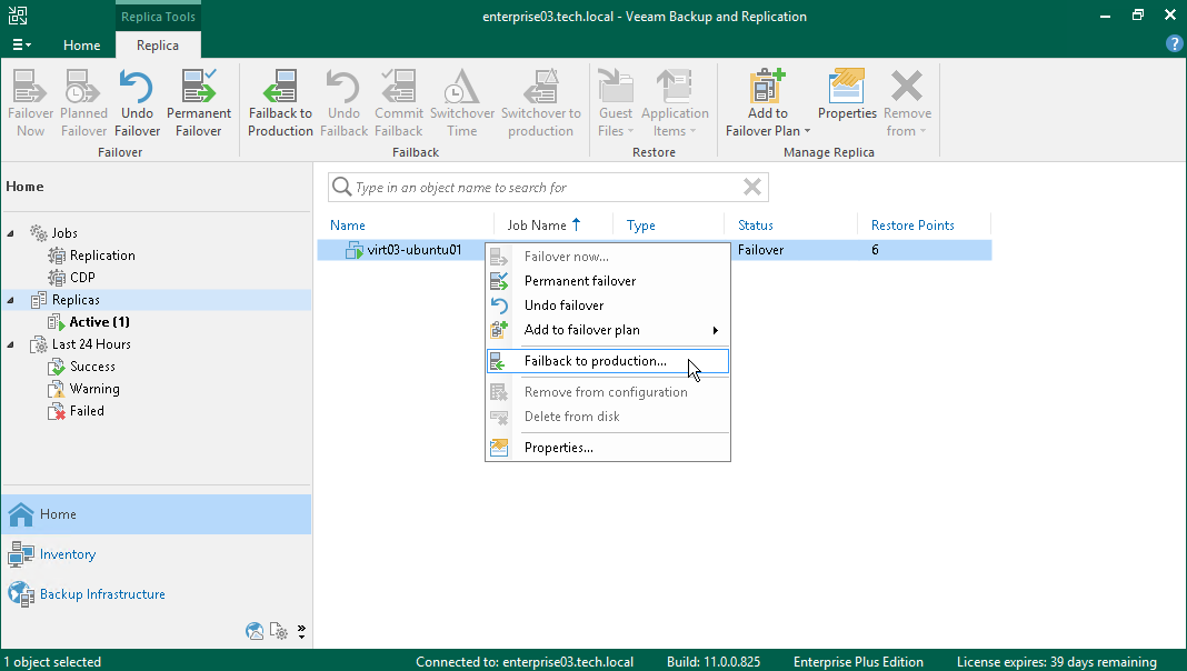 - Open the Home view. In the inventory pane navigate to the Replicas > Active node. In the working area, select the necessary replica and click Failback to Production on the ribbon.