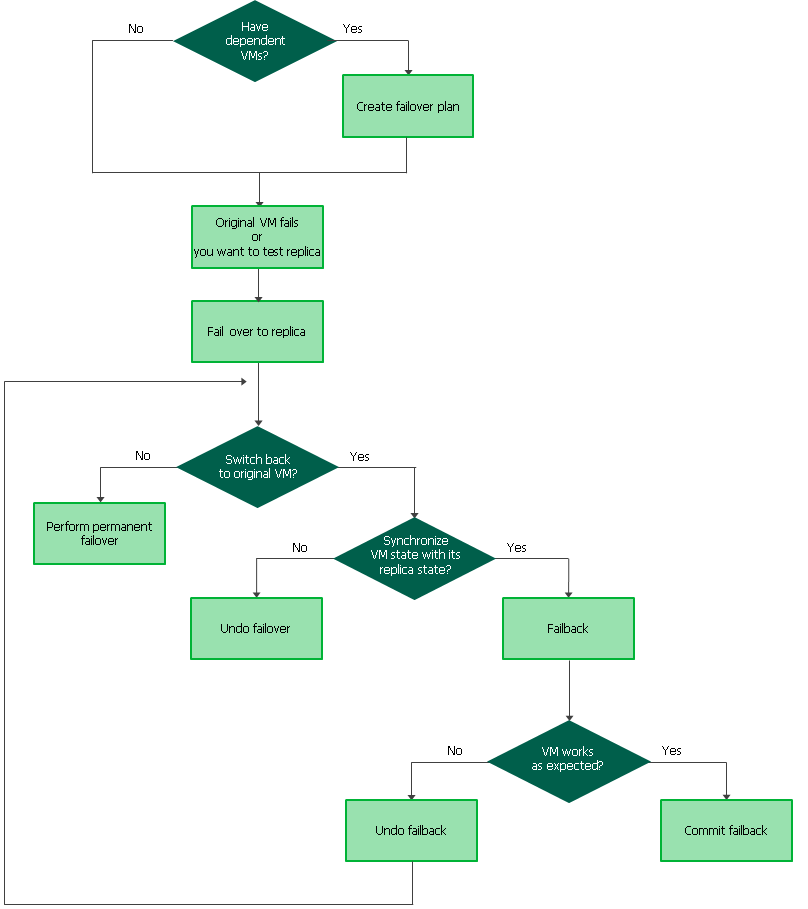 Failover and failback operations help you ensure that your business will function even if a disaster strikes your production site. Failover is a process of switching from the original VM on the source host to its VM replica on a host in the disaster recovery site. Failback is a process of returning from the VM replica to the original VM.