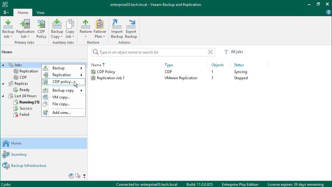 - Open the Home view. In the inventory pane, right-click Jobs and select CDP Policy.
