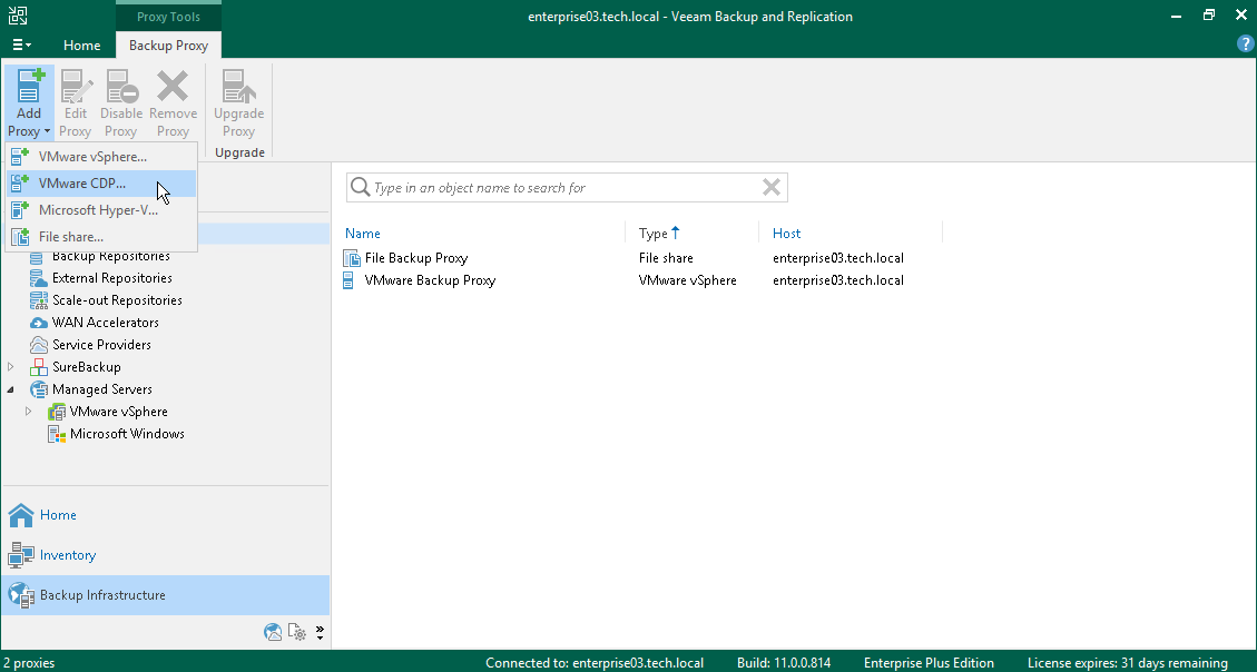 - Open the Backup Infrastructure view. In the inventory pane, select the Backup Proxies node. On the ribbon, click Add Proxy > VMware CDP.