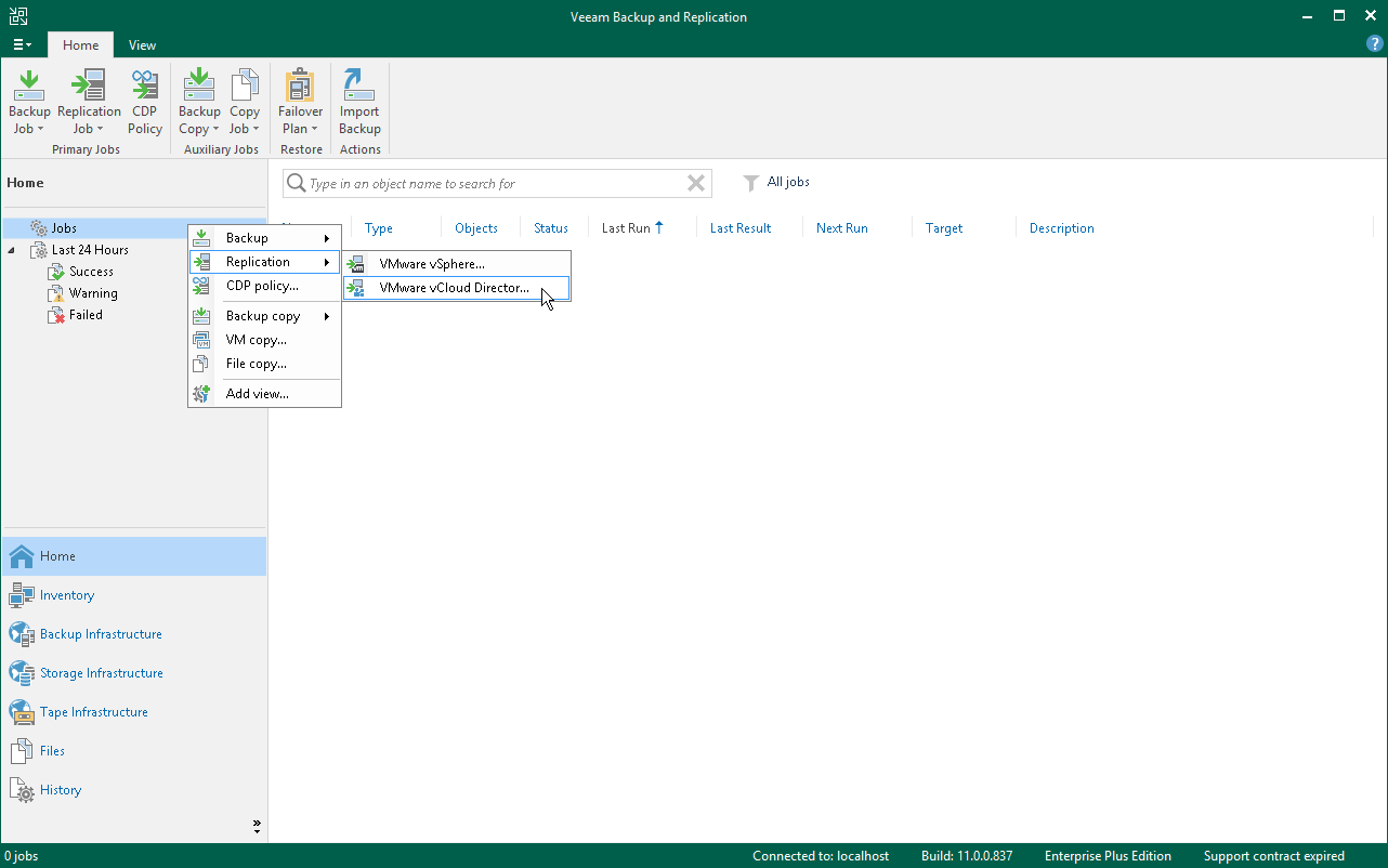 - Open the Home view, in the inventory pane right-click Jobs and select Replication > VMware vCloud Director.