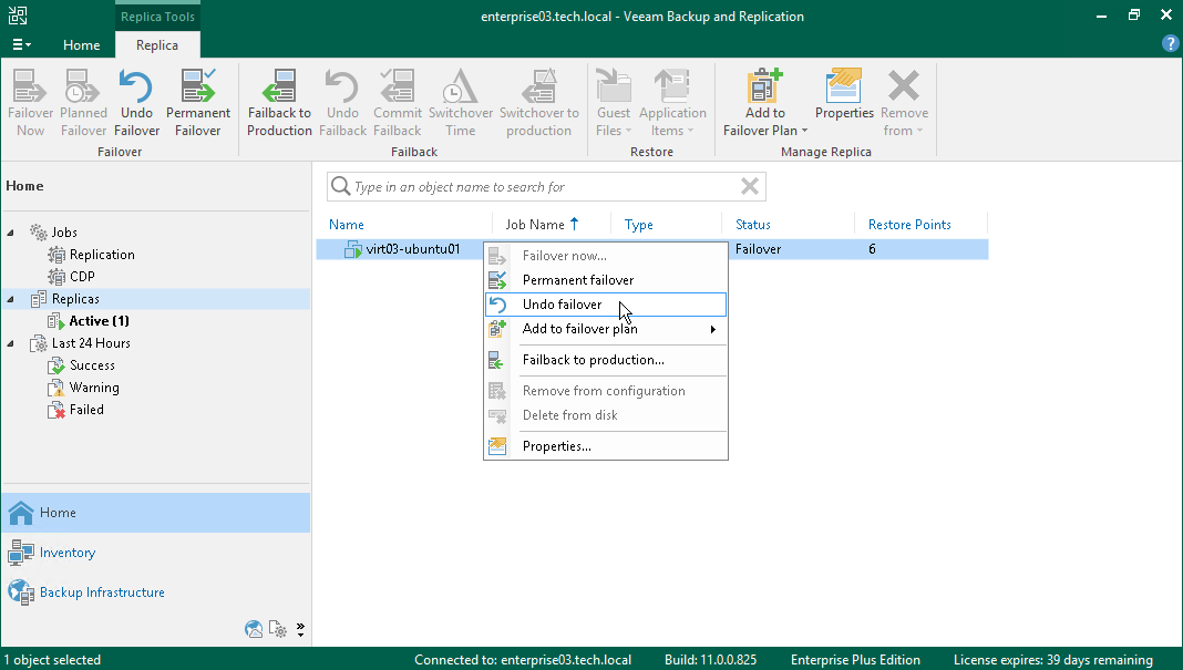 撤消故障切换 在本页面 To undo failover:Open the Home view.In the inventory pane, navigate to the Replicas > Active node.In the working area, select the necessary replica and click Undo Failover on the ribbon. As an alternative, you can right-click the replica and select Undo failover.