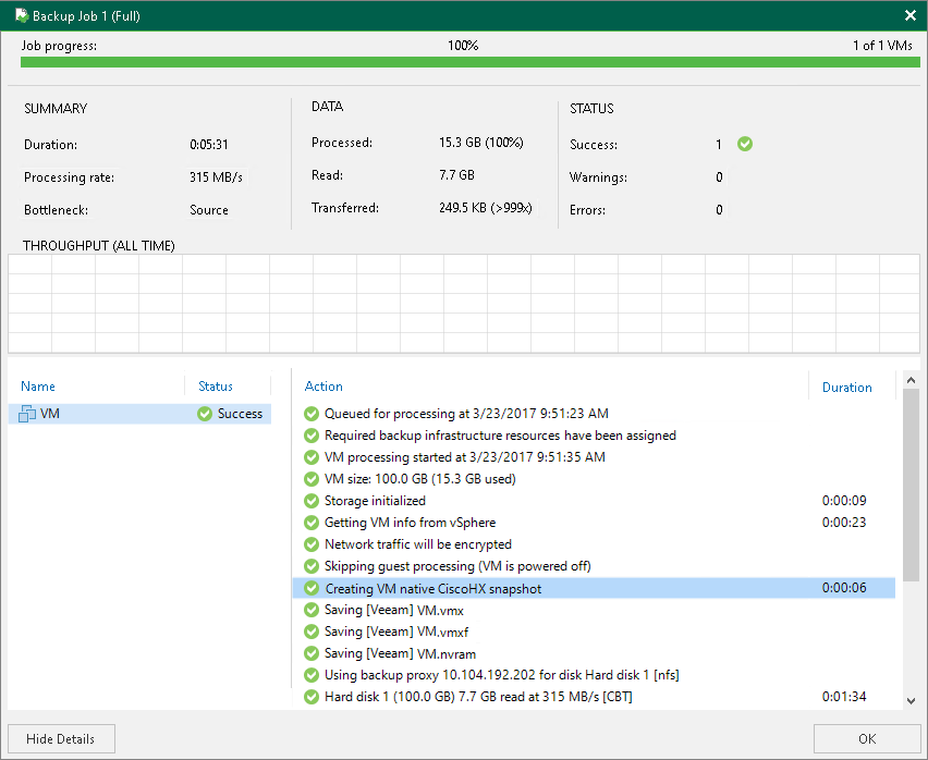 Implementation of integration with Cisco HyperFlex is different from those provided for other supported storage systems. When Veeam Backup & Replication processes VMs hosted on Cisco HyperFlex, it leverages snapshots created at the VM level, not snapshots created at the storage volumes level. The results of the VM processing are reported in job results: if a VM is processed with Cisco HyperFlex snapshots, Veeam Backup & Replication displays the 'Creating VM native Cisco HX snapshot' message in job statistics.