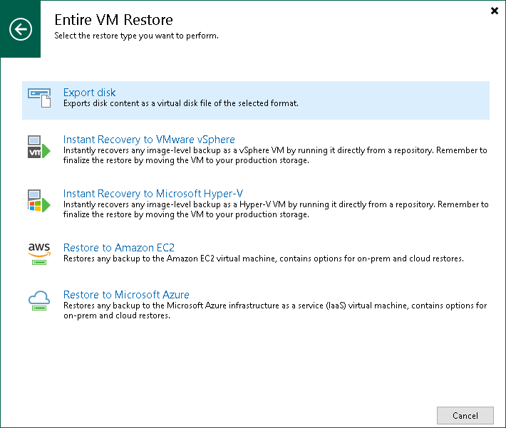 - AWS EC2 backup > Entire machine restore > Export disk — to export disks of EC2 instances from backups created with Veeam Backup for AWS.