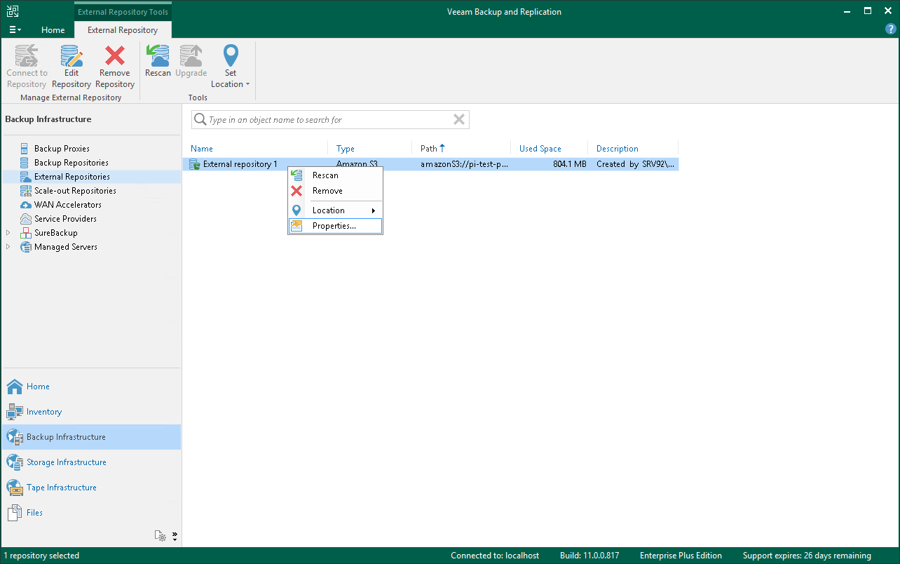 - In the working area, select an external repository and click Edit Repository on the ribbon or right-click the external repository and select Properties.