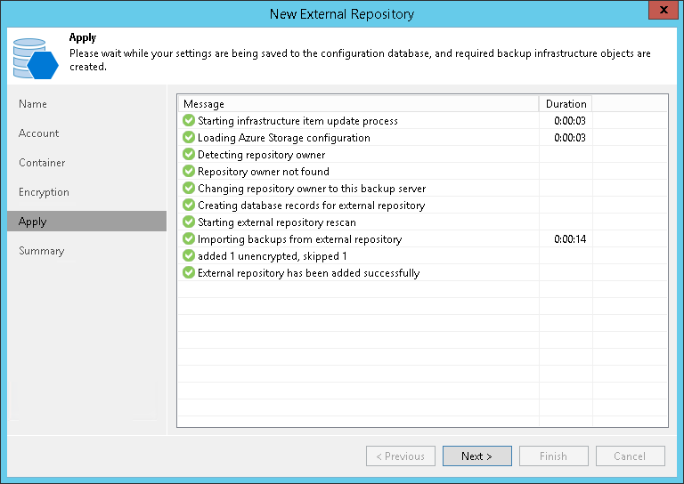第6步。应用设置 在本页面 At the Apply step of the wizard, wait for Veeam Backup & Replication to install and configure all required components. Then click Next to complete the procedure of adding the external repository to the backup infrastructure.