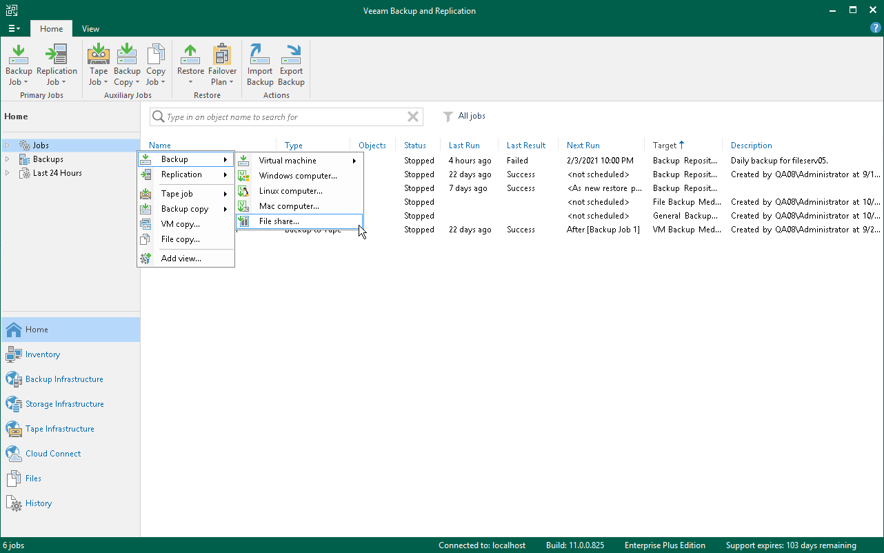 - Open the Home view. In the inventory pane, right-click Jobs and select Backup > File Share.