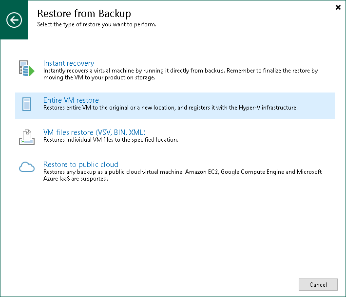 要启动Full VM Restore (虚拟机整机还原)向导,请执行以下任一操作: