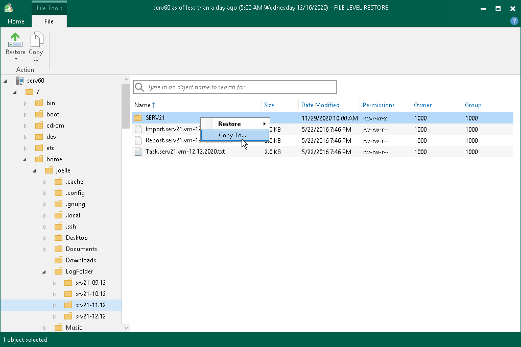 在Veeam Backup浏览器中,您可以执行以下操作: