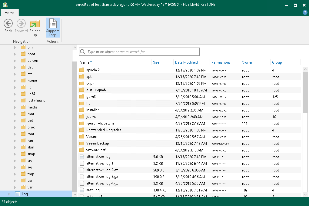 如果需要访问辅助设备的日志,请在Veeam Backup浏览器功能区上单击Support Logs (支持日志)。 Veeam Backup & Replication将显示文件系统树下的Log (日志)节点。 要隐藏此节点,请再次单击Support Logs (支持日志)。