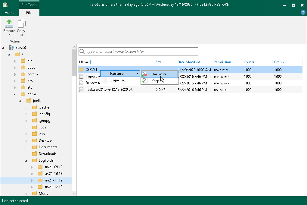 - 如需使用从备份中还原的文件覆盖虚拟机客户机操作系统上的原始文件,请选择Restore (还原) >Overwrite (覆盖)。