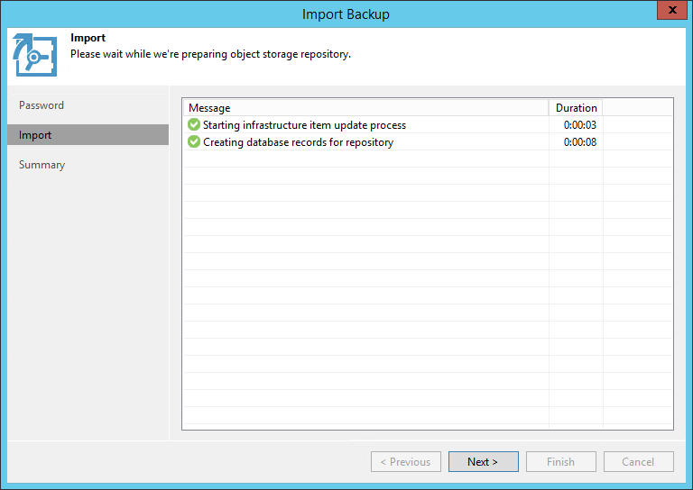 第3步。等待导入 在本页面 At the Import step of the wizard, wait until Veeam Backup & Replication prepares a temporary database to which information about backups will be added upon import.