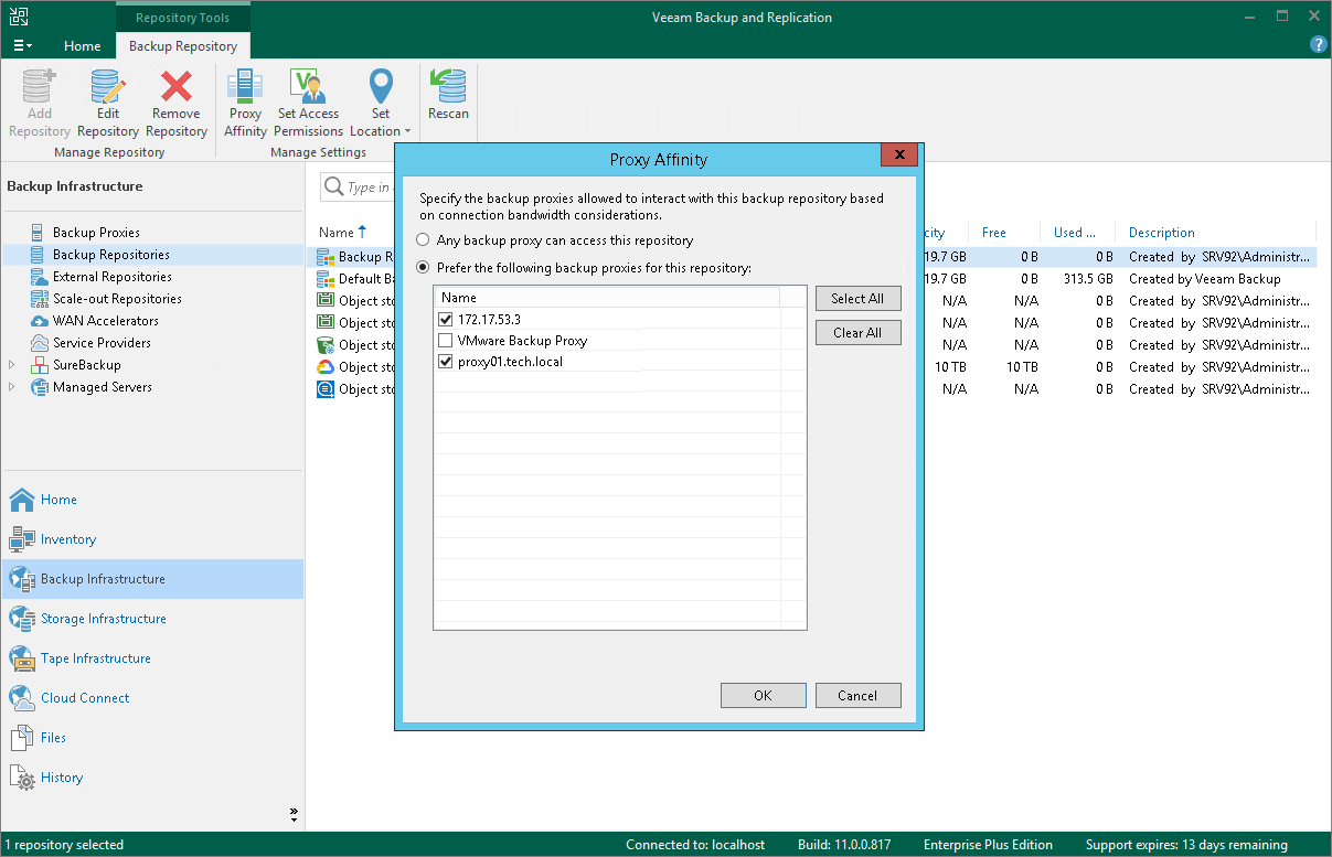 - In the working area, select the backup repository and click Proxy Affinity on the ribbon or right-click the backup repository and select Proxy affinity.