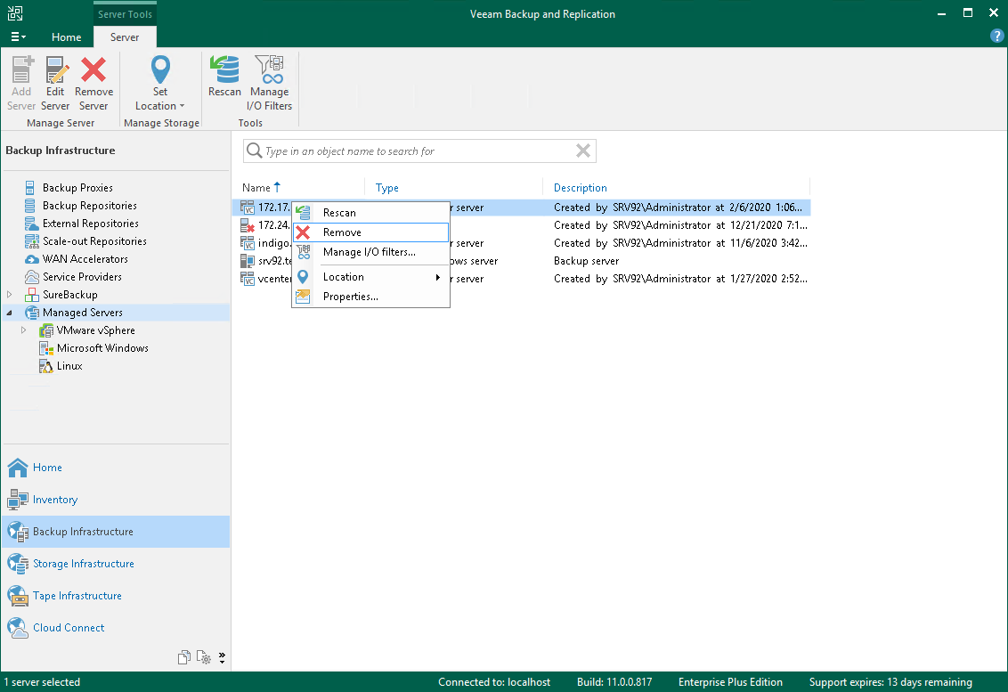You cannot remove a server that has any dependencies. For example, you cannot remove a server that is referenced by a backup or replication job, performs the role of a backup proxy or backup repository. To remove such server, you will need to delete all referencing jobs and roles first.