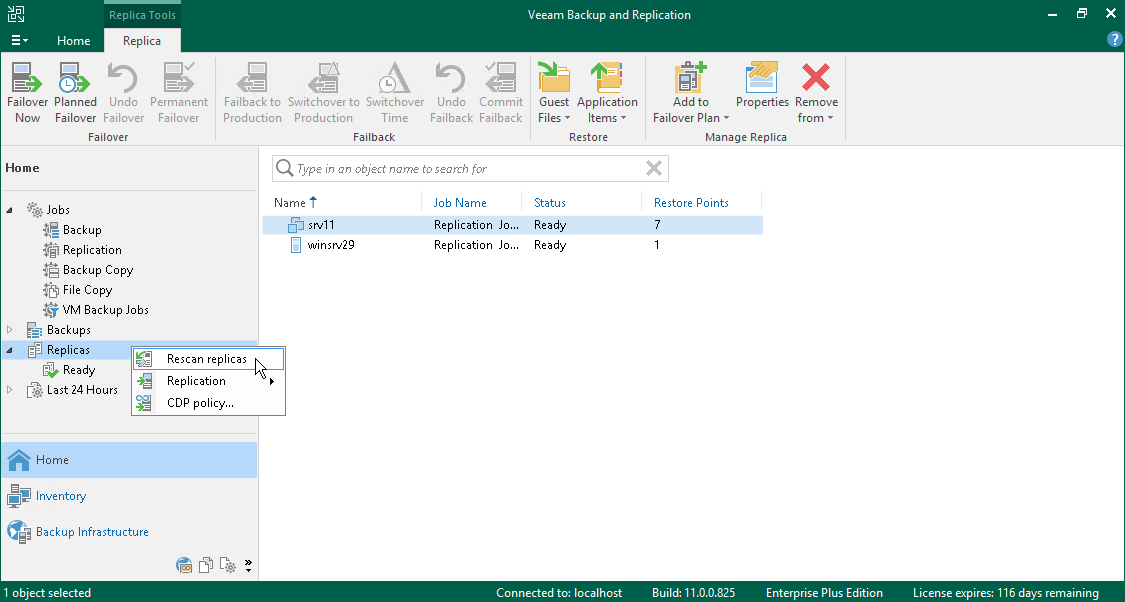 - In the inventory pane, right-click the Replicas node and select Rescan Replicas.