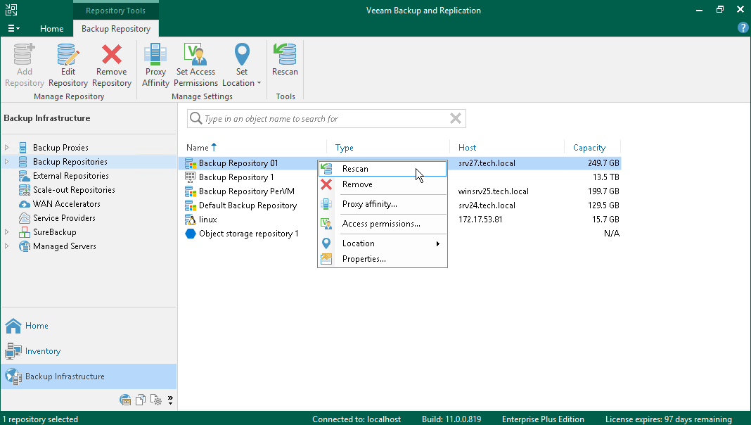 - In the working area, select the backup repository and click Rescan Repository on the ribbon or right-click the backup repository and select Rescan repository.