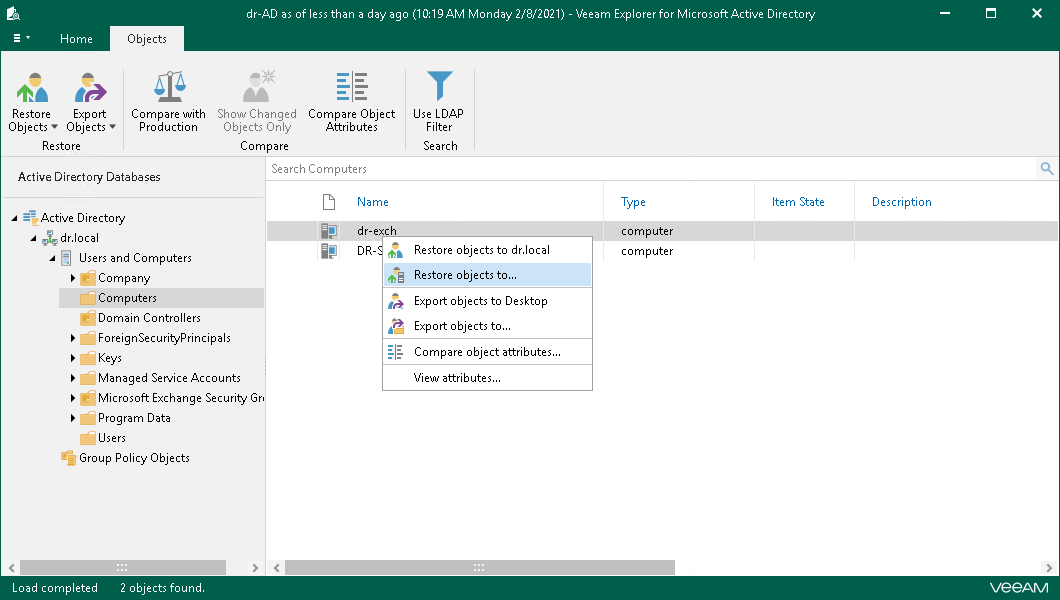 - 在工作区中,在备份或虚拟机复制副本中选择所需的计算机,然后在功能区上单击Application Items(应用程序项目)> Microsoft Active Directory(Microsoft Active Directory )。或者,右键单击计算机或虚拟机复制副本,然后选择 Restore application items (还原应用程序项目) >Microsoft Active Directory objects (Microsoft Active Directory对象)。