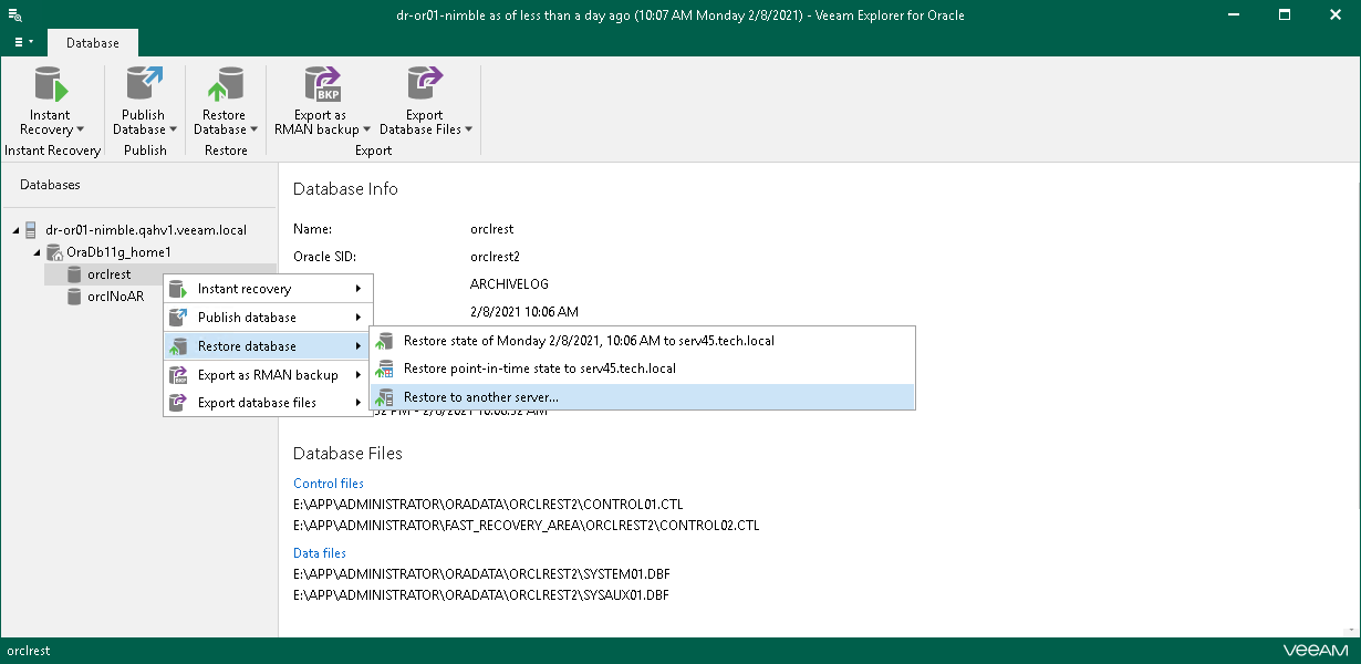 然后Veeam Backup & Replication打开Veeam Explorer for Oracle。在此资源管理器中,您可以查看,还原数据库等。Veeam Backup Explorers用户指南的Veeam Explorer for Oracle主要部分提供了详细信息。例如:
